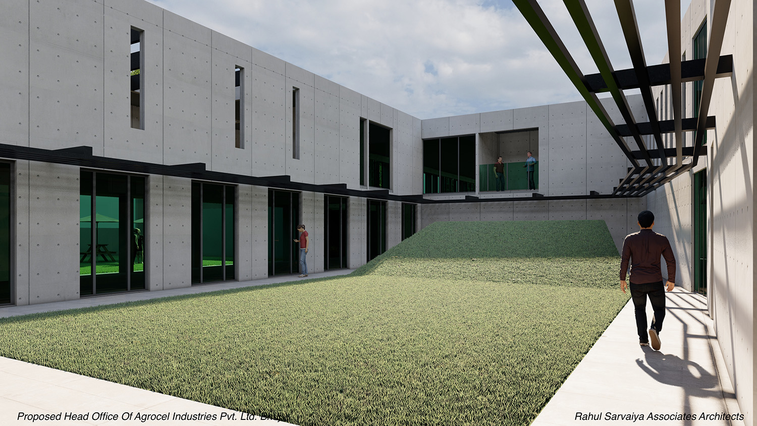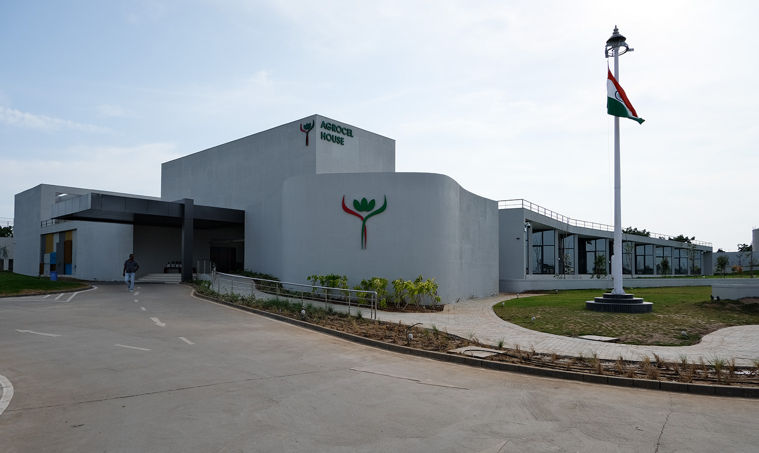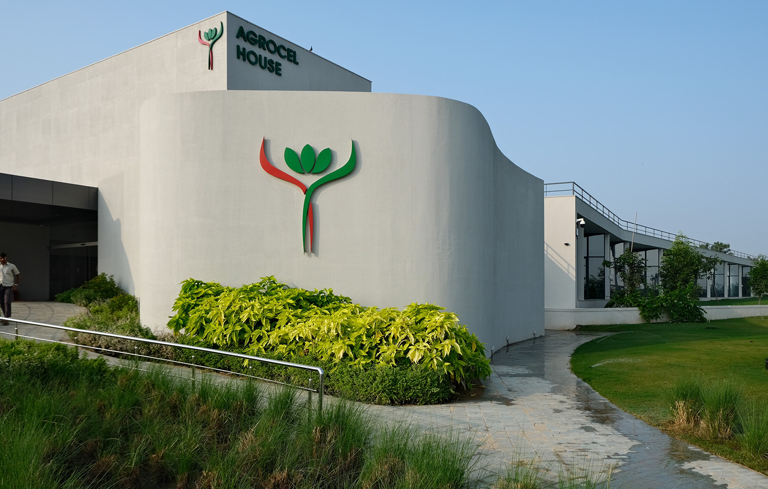 The core design concept of Agrocel House revolves around connectivity and harmony with nature. To bring this vision to life, the building’s layout sprawls across a vast plot, folding at calculated angles to create a dynamic and intriguing form. These deliberate folds generate looping spaces that naturally give rise to courtyards. The looping axes of the building ensure that one always encounters an open green space or courtyard while navigating through the premises. Each cabin, office, or staff area has been thoughtfully positioned to remain connected to open or landscaped spaces, fostering a sense of openness and well-being.
