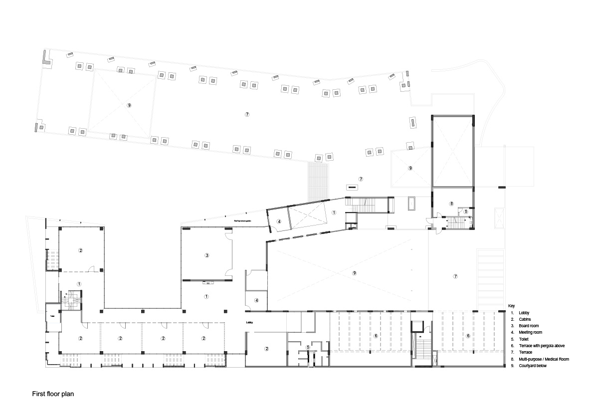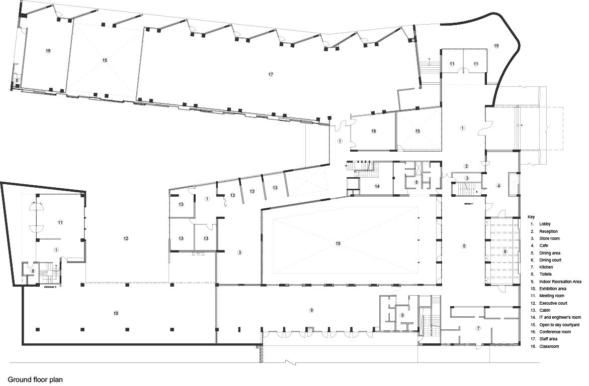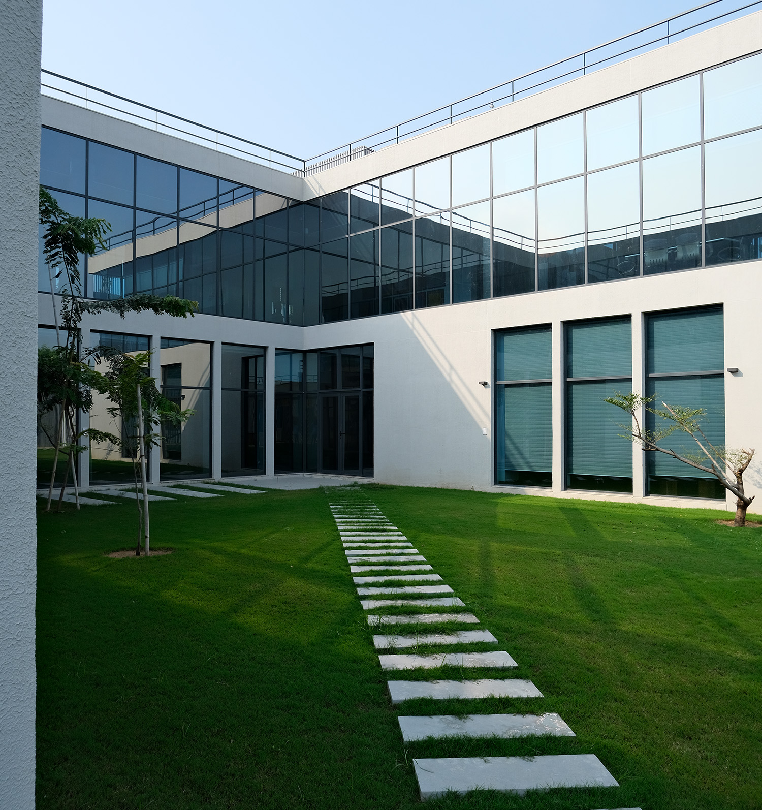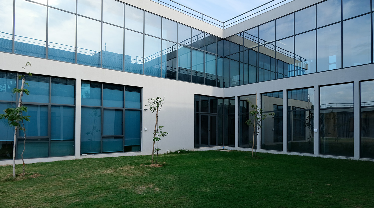 The core design concept of Agrocel House revolves around connectivity and harmony with nature. To bring this vision to life, the building’s layout sprawls across a vast plot, folding at calculated angles to create a dynamic and intriguing form. These deliberate folds generate looping spaces that naturally give rise to courtyards. The looping axes of the building ensure that one always encounters an open green space or courtyard while navigating through the premises. Each cabin, office, or staff area has been thoughtfully positioned to remain connected to open or landscaped spaces, fostering a sense of openness and well-being.