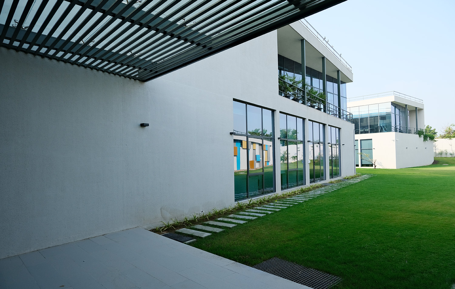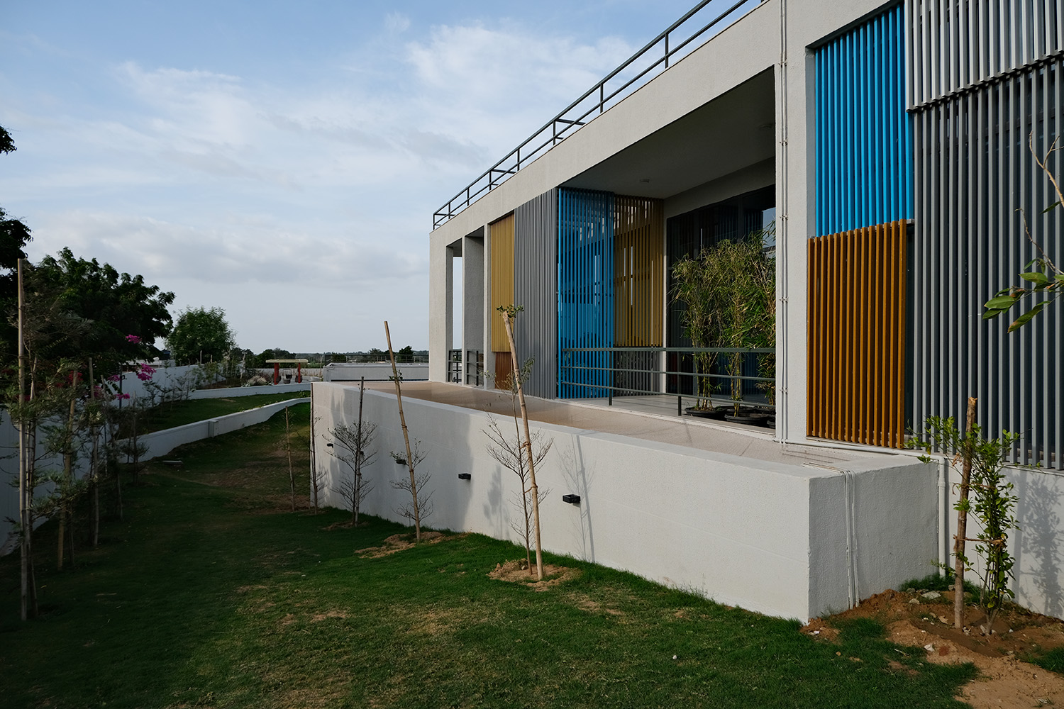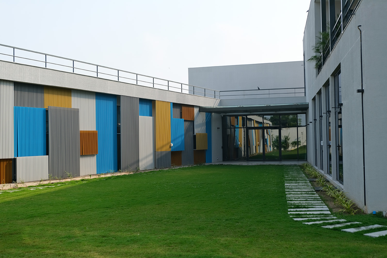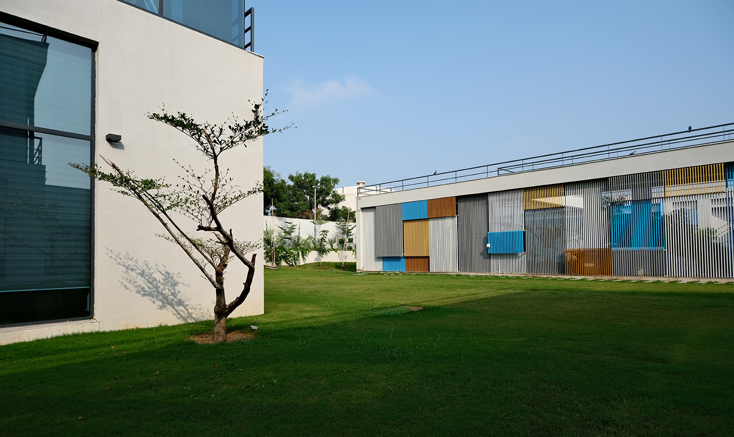 One of the standout features of Agrocel House is its striking jaali facade. Composed of vertical aluminum members, powder-coated in vibrant shades of blue, orange, and chrome yellow, the facade breaks the monotony of the all-white exterior. This design not only adds a splash of color but also creates an ever-changing interplay of light and shadow within the interiors, adding a layer of visual intrigue.