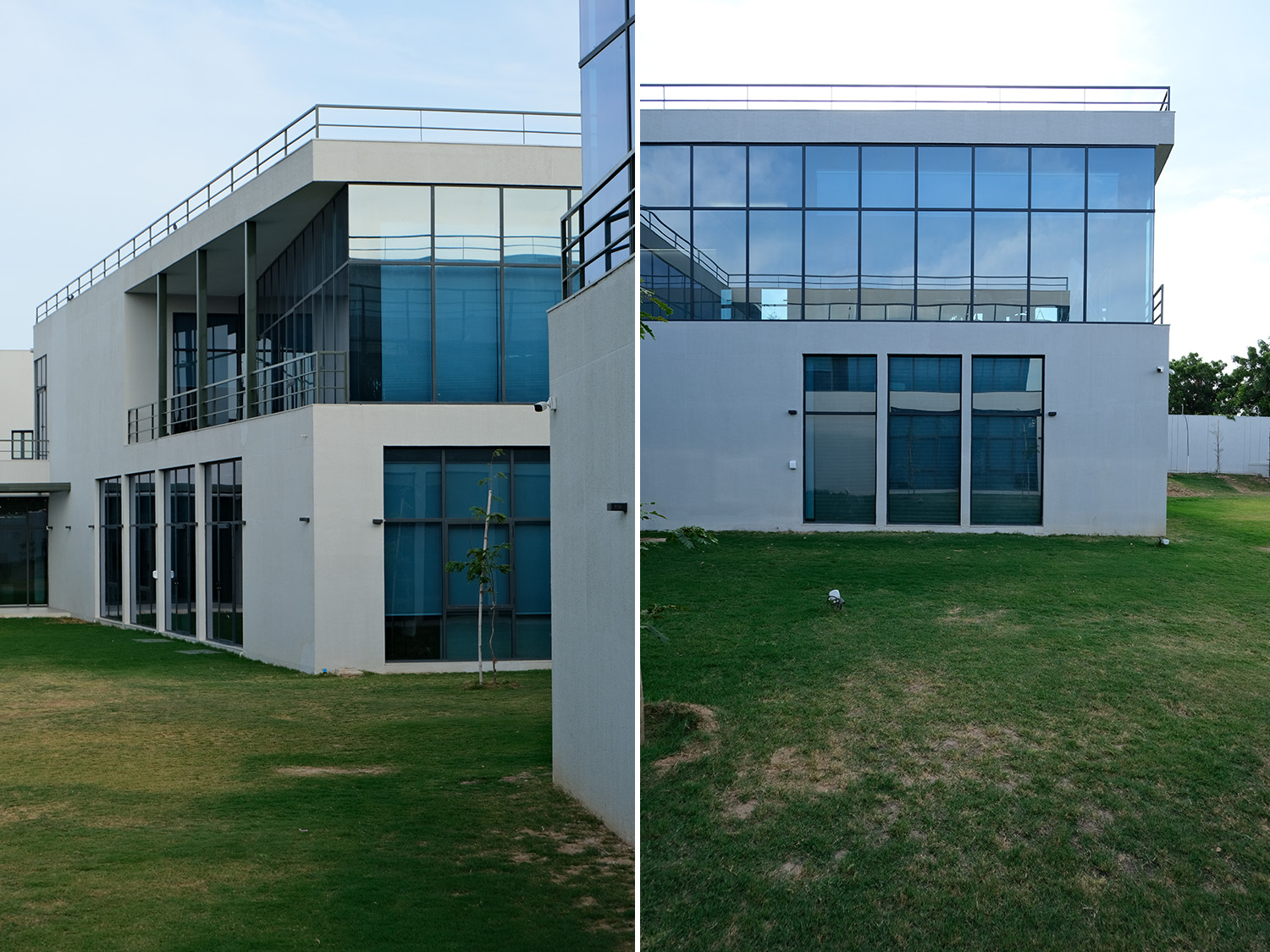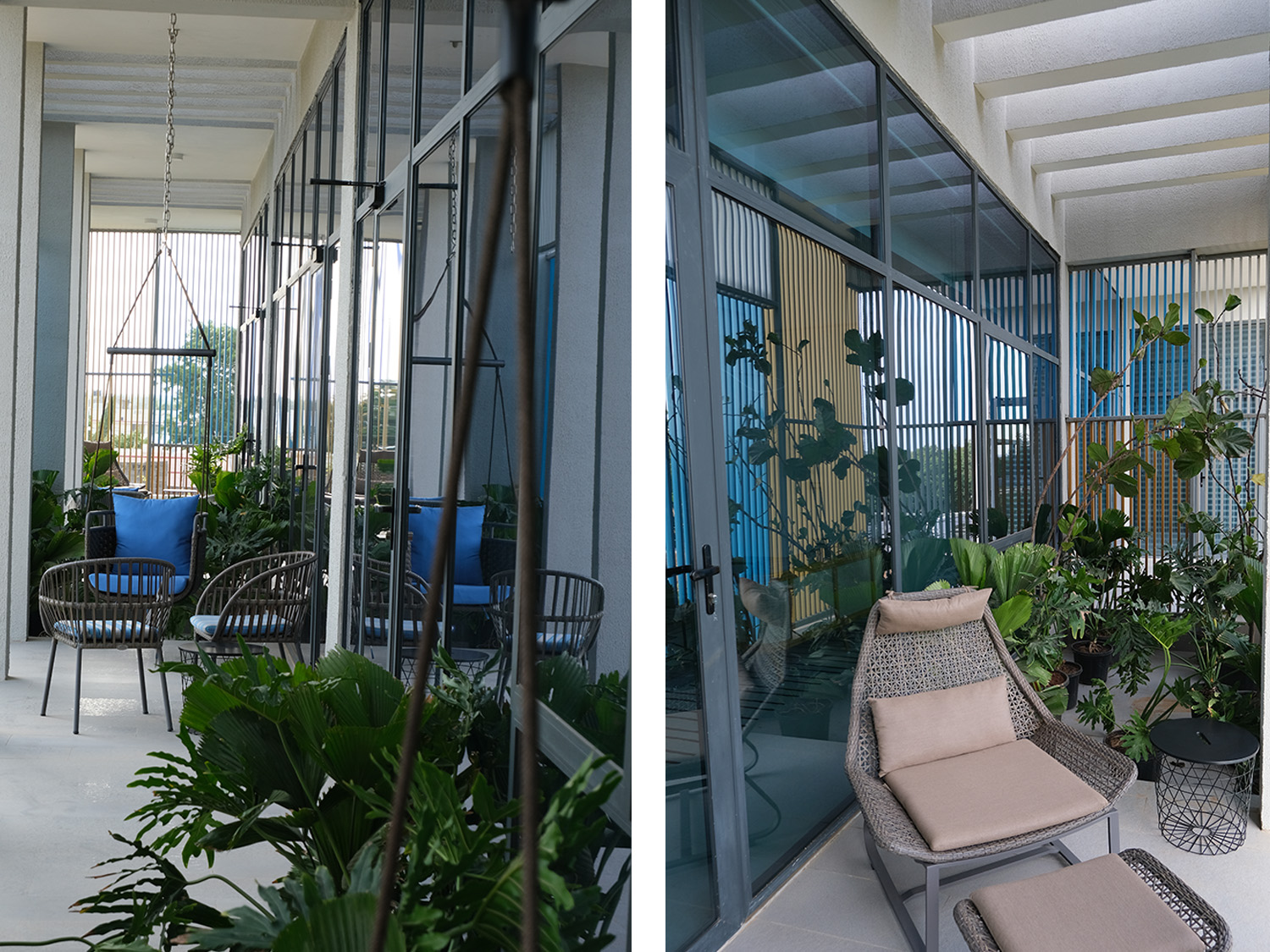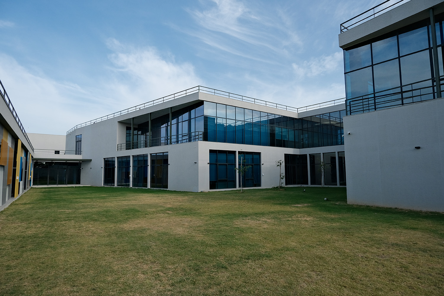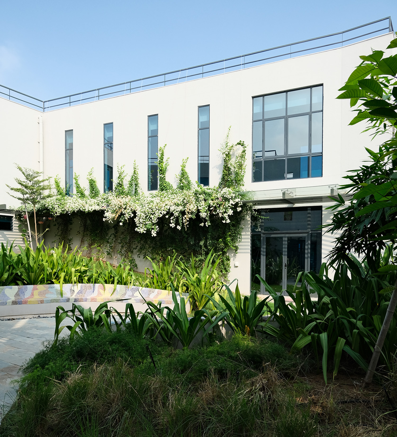 One of the standout features of Agrocel House is its striking jaali facade. Composed of vertical aluminum members, powder-coated in vibrant shades of blue, orange, and chrome yellow, the facade breaks the monotony of the all-white exterior. This design not only adds a splash of color but also creates an ever-changing interplay of light and shadow within the interiors, adding a layer of visual intrigue.