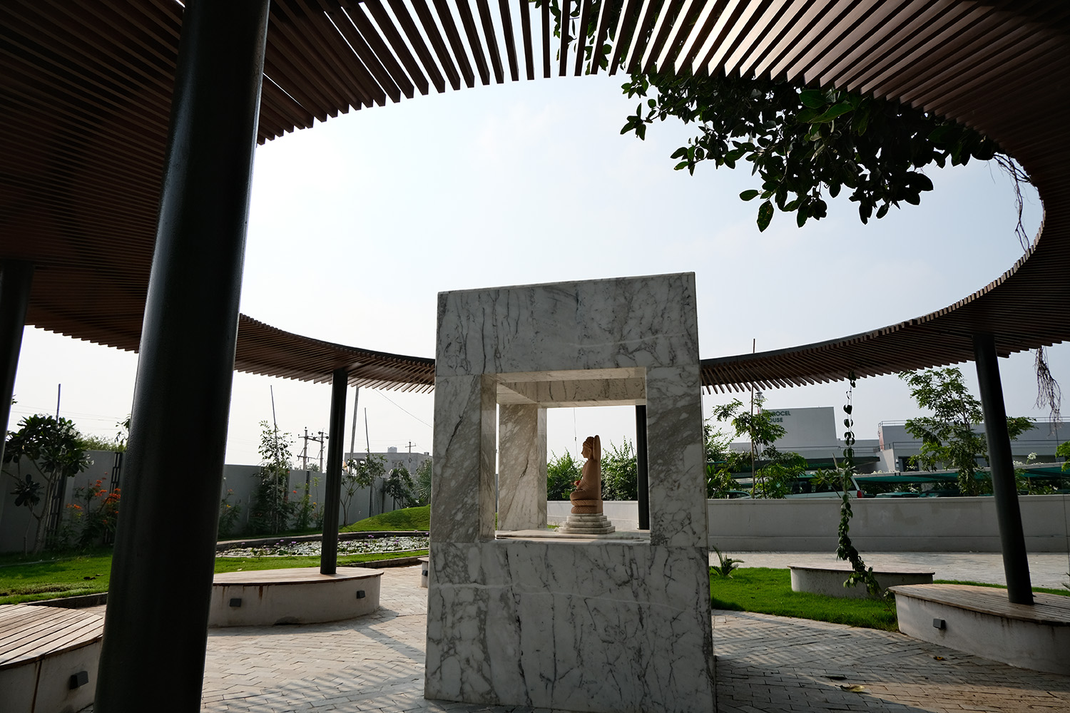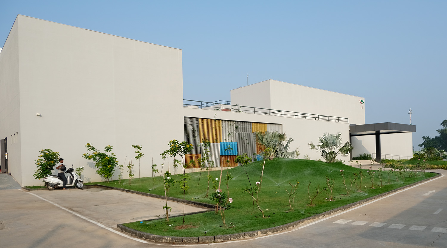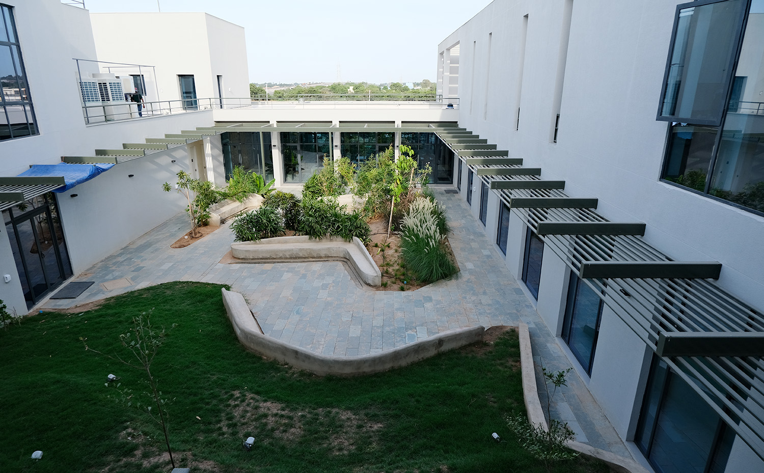 At the heart of Agrocel House are the central courtyard and executive courtyard, which serve as key highlights. These courtyards feature contoured landscapes with in-situ benches, offering employees a versatile space for interaction and relaxation. The front contoured landscape, an extension of the office area, further enhances the building’s functionality. Acting as a recreational space, it accommodates office events, gatherings, and casual breaks. This space also includes a pergola and a serene temple, fostering an atmosphere of tranquility.