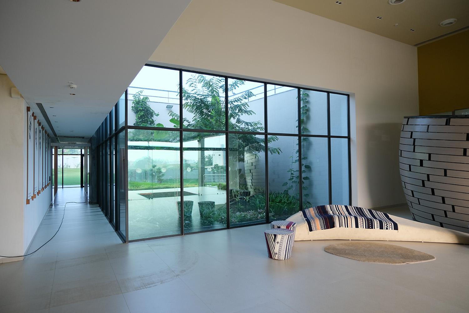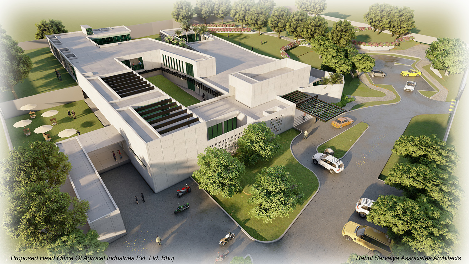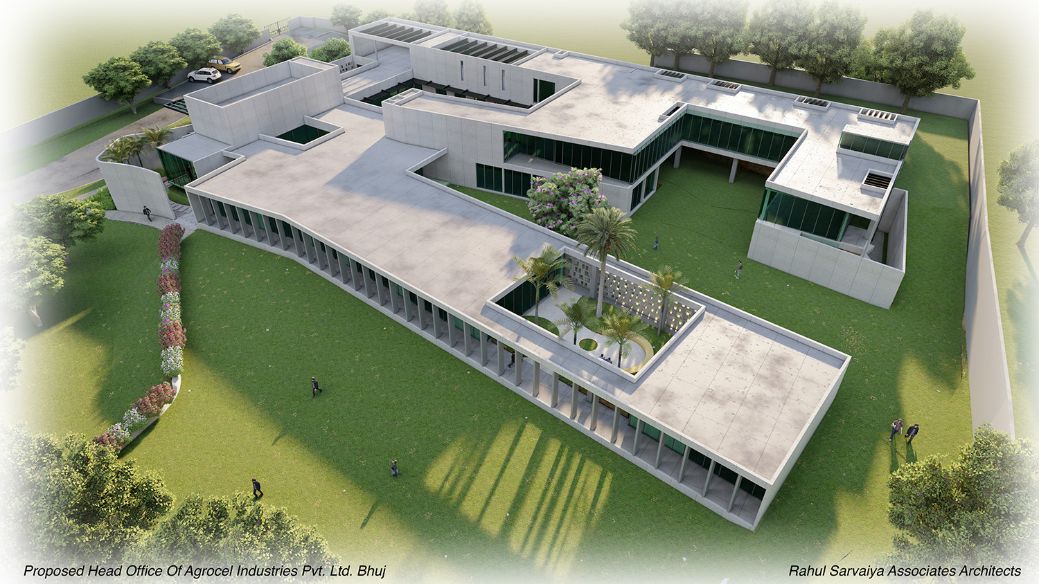 Agrocel House, the headquarters of Agrocel Industries Pvt. Ltd., stands as a remarkable reflection of the evolving Indian rural fabric. Located in Bhuj, this architectural marvel seamlessly blends open, semi-open, and closed spaces, with courtyards serving as the central theme. The building proudly features seven distinct courtyards of varying sizes, each adorned with diverse flora that enrich the experience of the space.