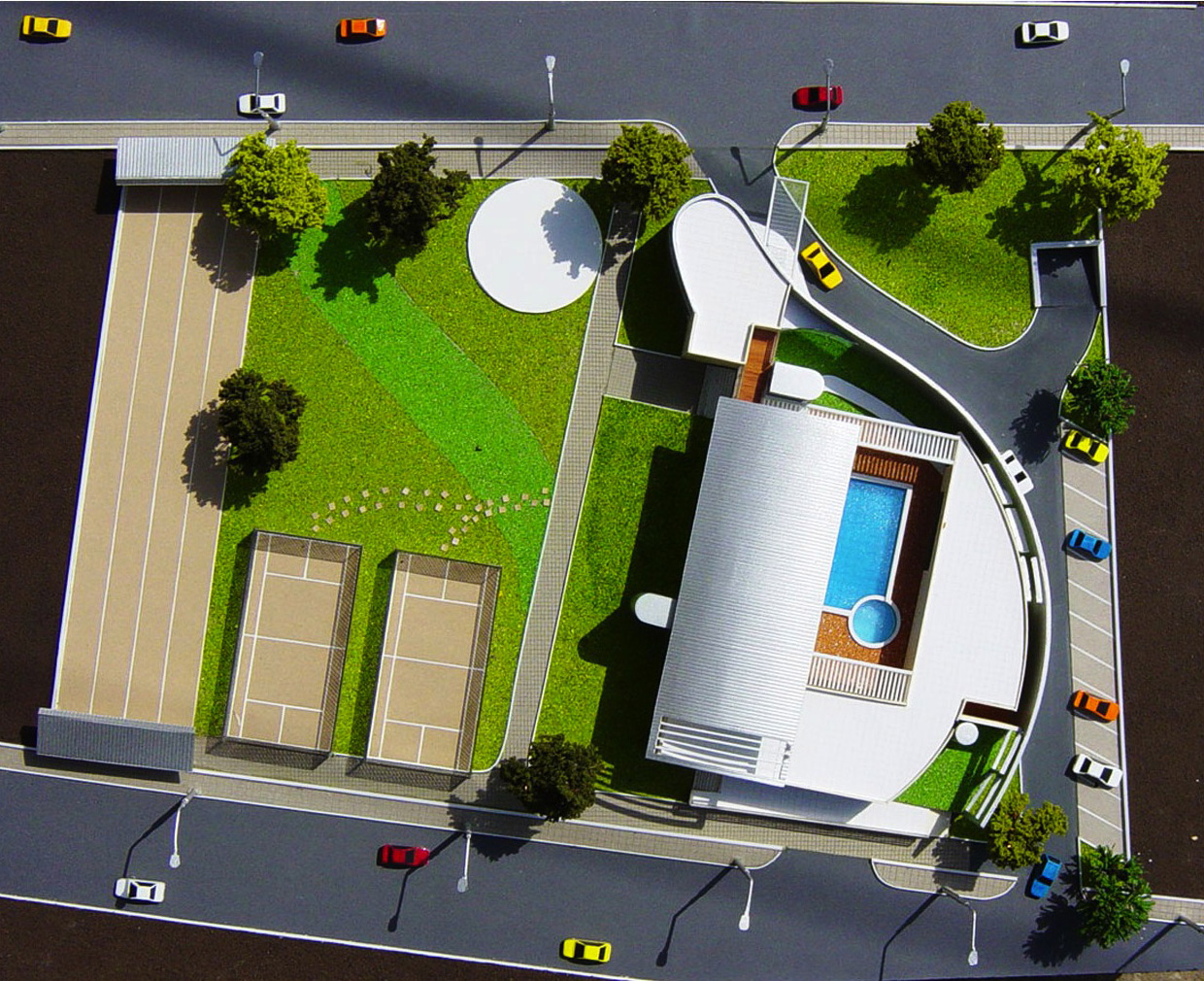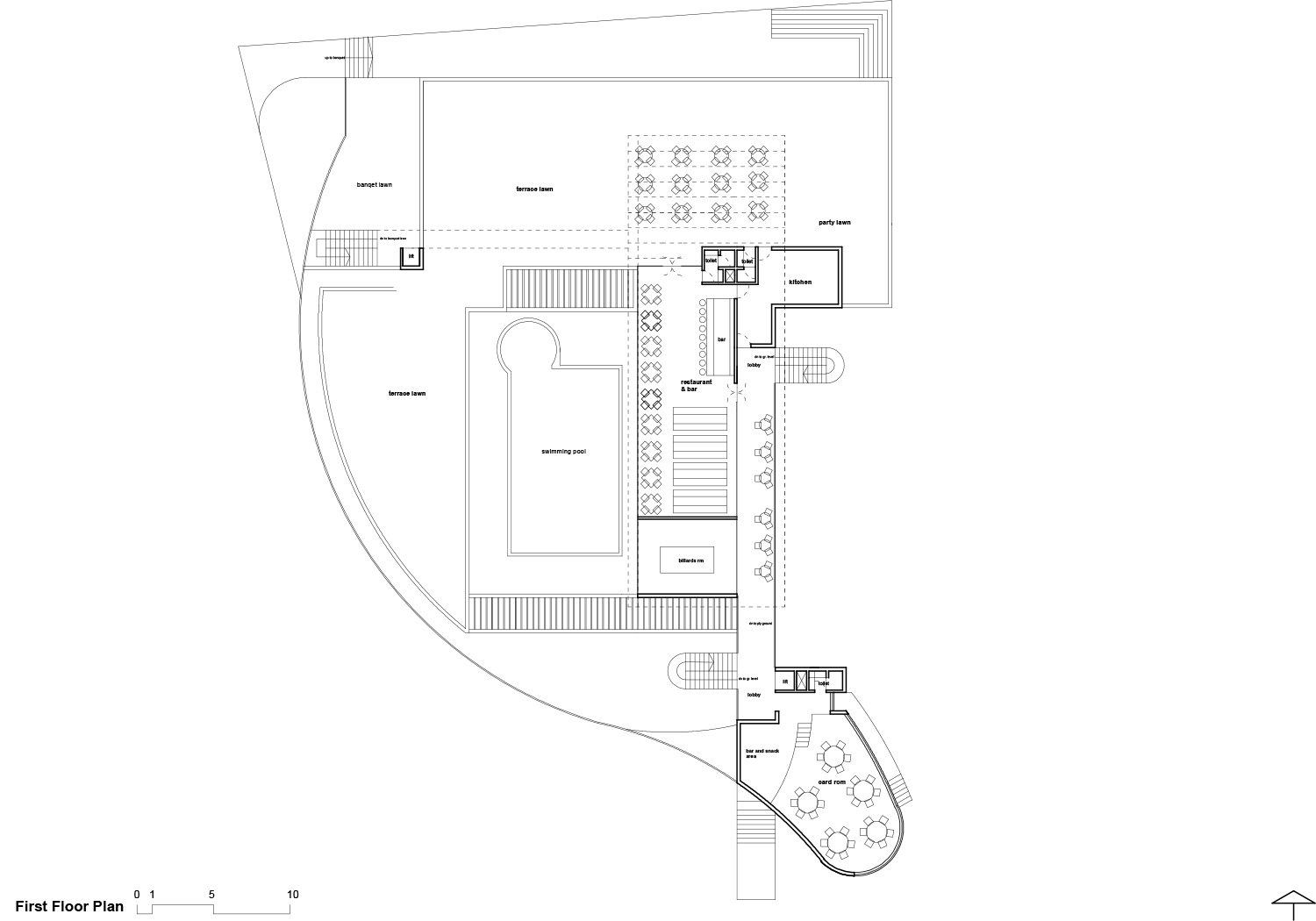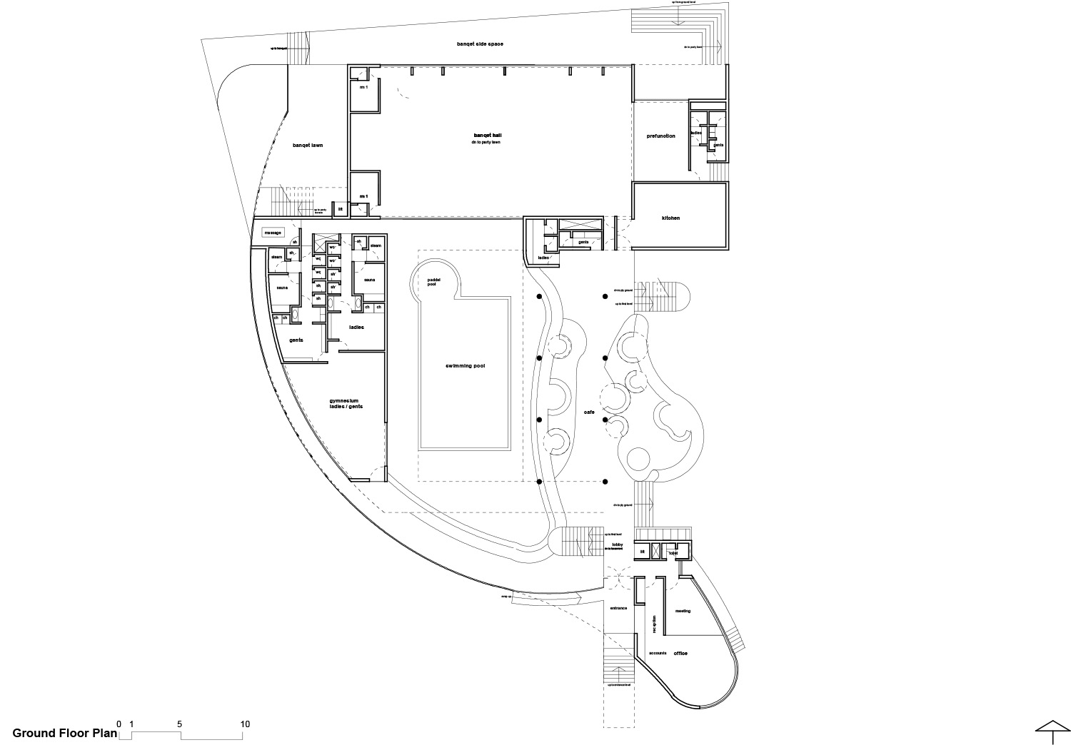 A defining feature of the club is its unconventional building shape, a creative solution to the challenges posed by the restrictive plot area. The structure comprises smaller interconnected buildings, joined by bridges on the first floor. This innovative layout is enveloped by a curved screen, which not only adds a distinctive aesthetic but also ensures privacy for the occupants.