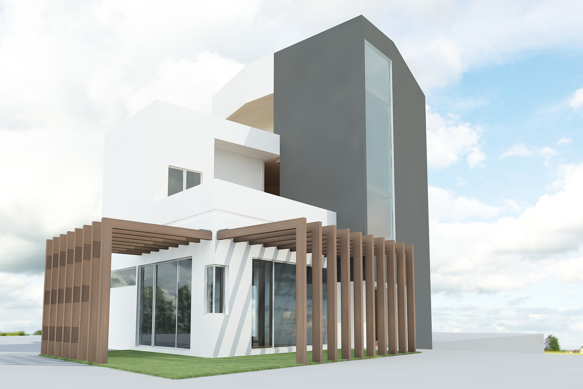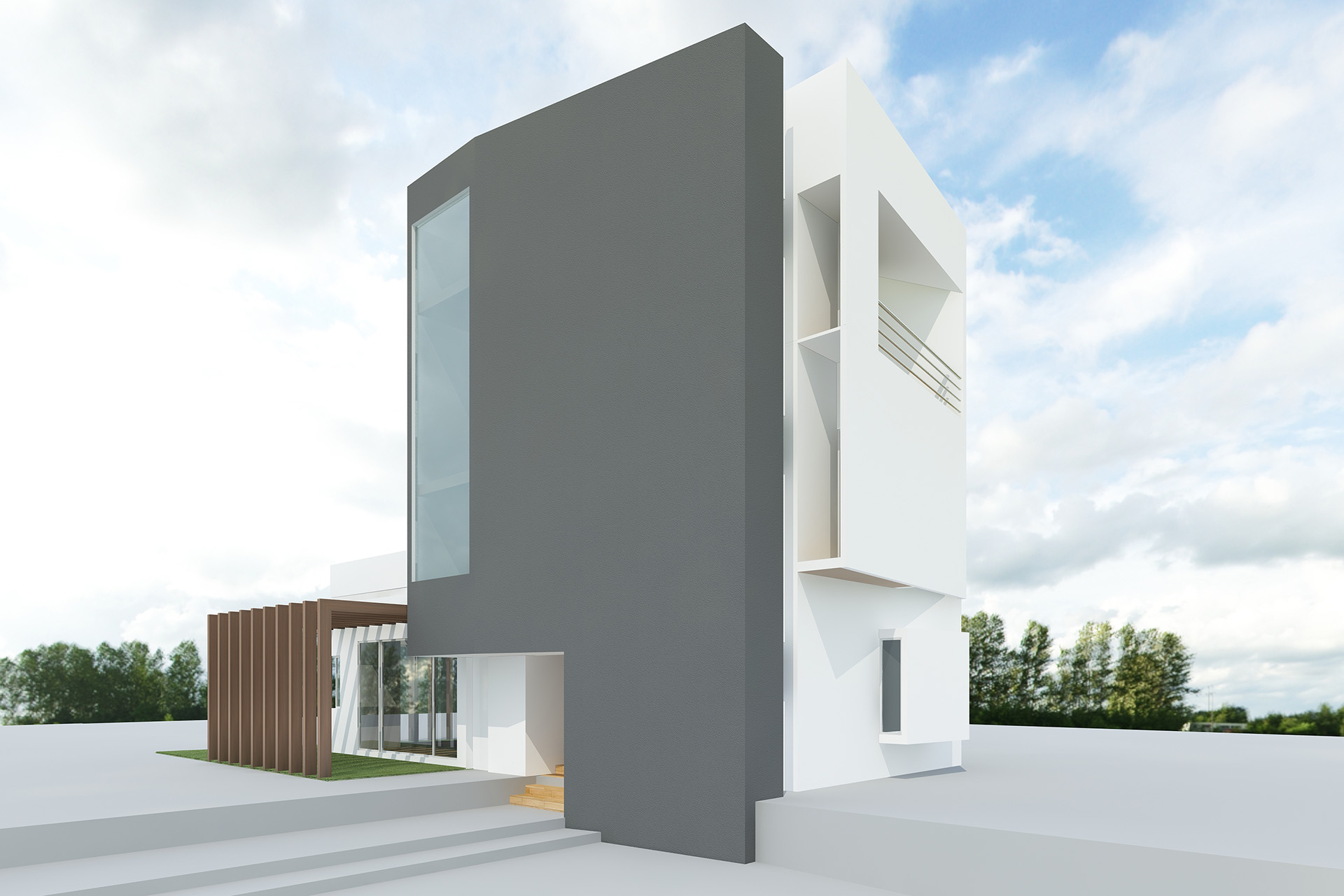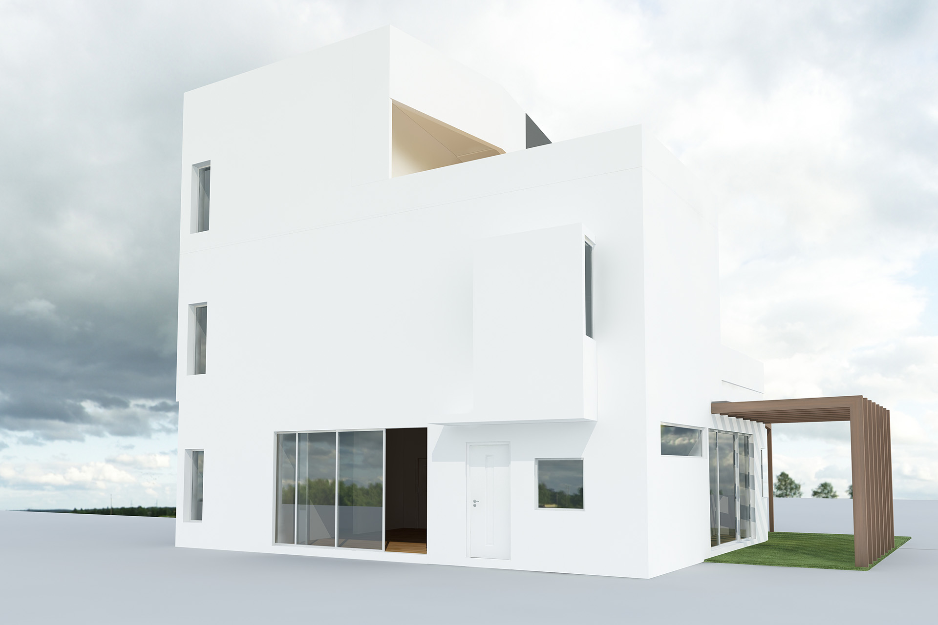 Large windows are strategically incorporated into the structure, flooding the interiors with natural light and offering a seamless connection to the outdoors. This thoughtful approach not only elevates the aesthetic but also enhances the functionality of the space, making it a perfect example of minimalist yet practical architecture.