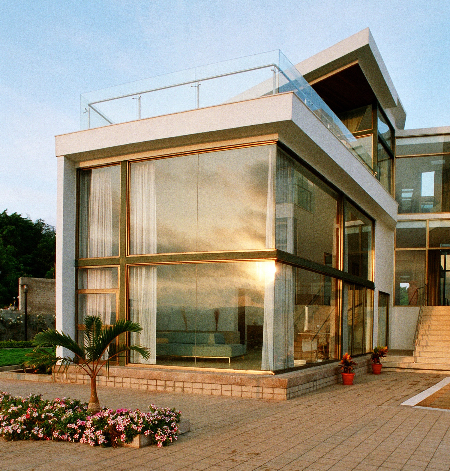 The design integrates geometric forms, with courtyards seamlessly connecting indoor and outdoor spaces, enhancing the home’s relationship with nature. A perforated feature wall adds privacy while offering glimpses of the structure, complemented by landscaped lawns, vibrant flower beds, and a striking entrance flanked by modern lighting.